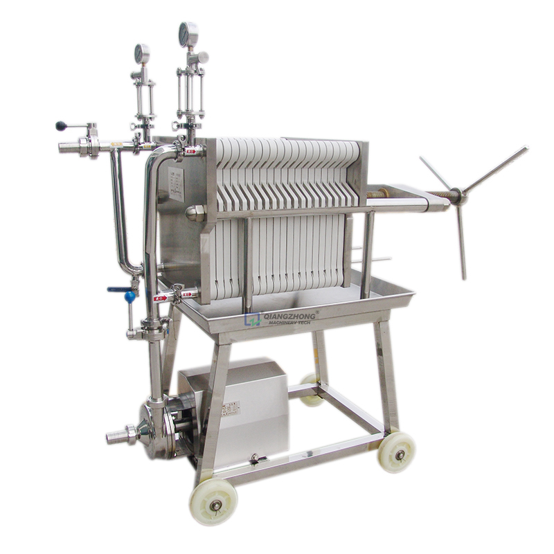 不锈钢板框式精滤机的每块滤板的四角有4个通液角孔,只有一侧竖向的2个角孔与内部相通,滤板与滤框交替排列(两面带孔板的为滤板,无孔板的为滤框)。过滤时,由滤框一侧的2个通液角孔进料,透过过滤层(过滤介质)后,清液由滤板一侧的2个出液角孔排出。